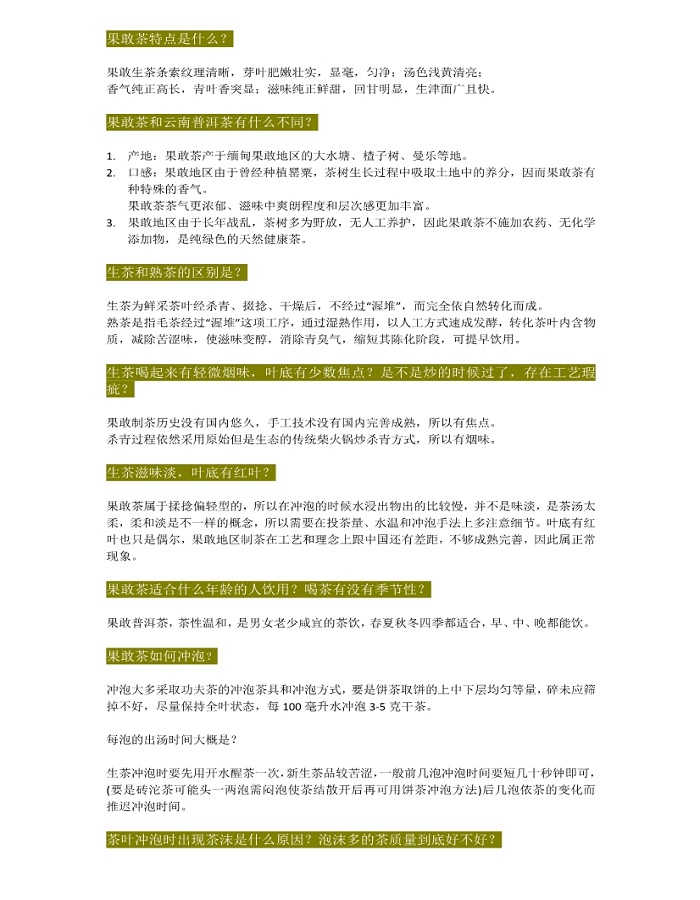 1. 香氣馥郁:秘境果敢生茶苦澀味低、香氣馥郁、天然花香滋味醇厚、回甘生津、舌底鳴泉、喉韻綿長。